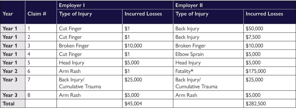 To illustrate insurance premium calculations (which may vary based on the difference in injury rates), hypothetical calculations were made for two employers, Employers I and II, who have the same payroll. On the next page, Table A shows the payroll data for each type of employee. Table B illustrates the excessive injuries of Employer I and Employer II. Employer II has four more injuries than Employer I, resulting in a total loss of $282,500, compared to a total loss of $45,004 during the same period. While the insurance company pays these losses, the difference between the two premiums is $174,540. A savings of $174,540 due to fewer injuries (Employer I, see Table C) provides a competitive advantage.